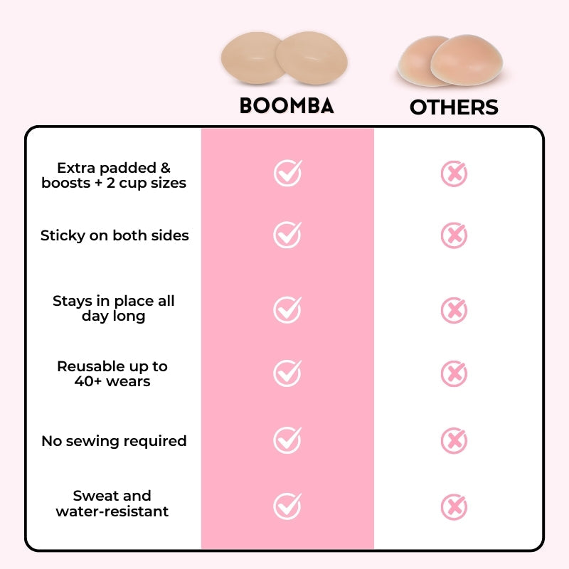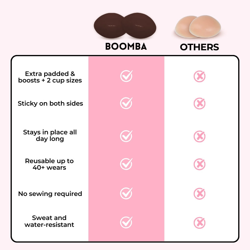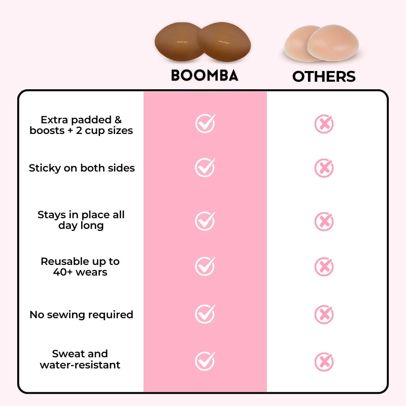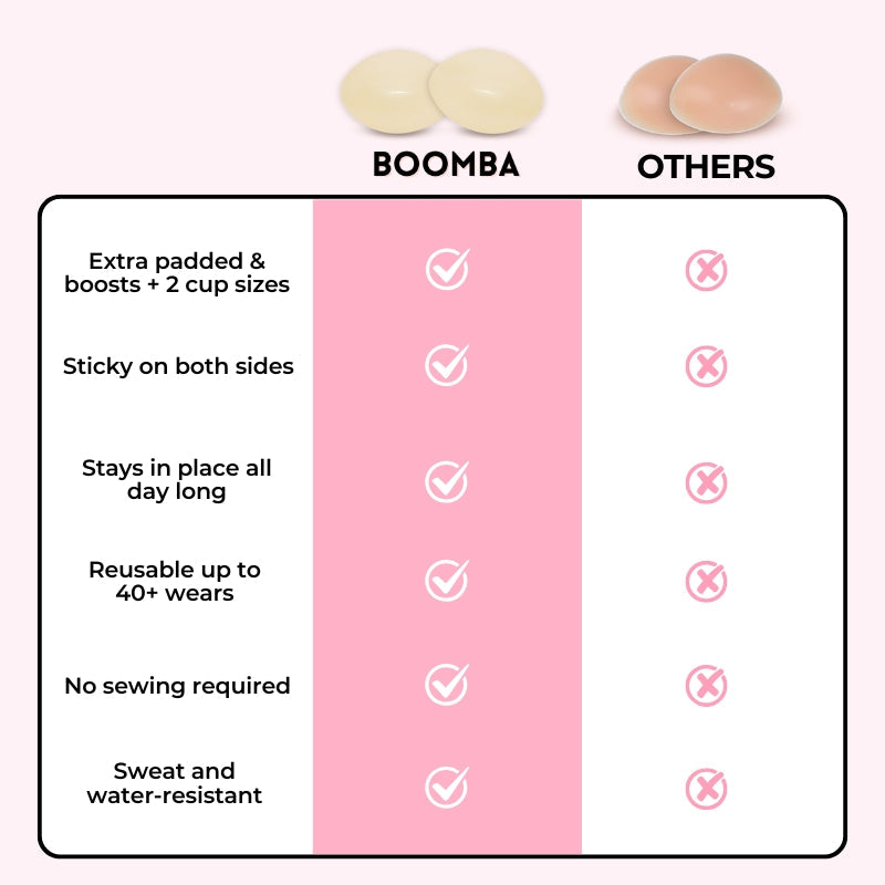 Unlike a sticky bra that is supported by the adhesive, BOOMBA inserts are supported by the clothing, they cannot stay up by themselves. It is crucial to wear them in tight, structured, and fitted tops.