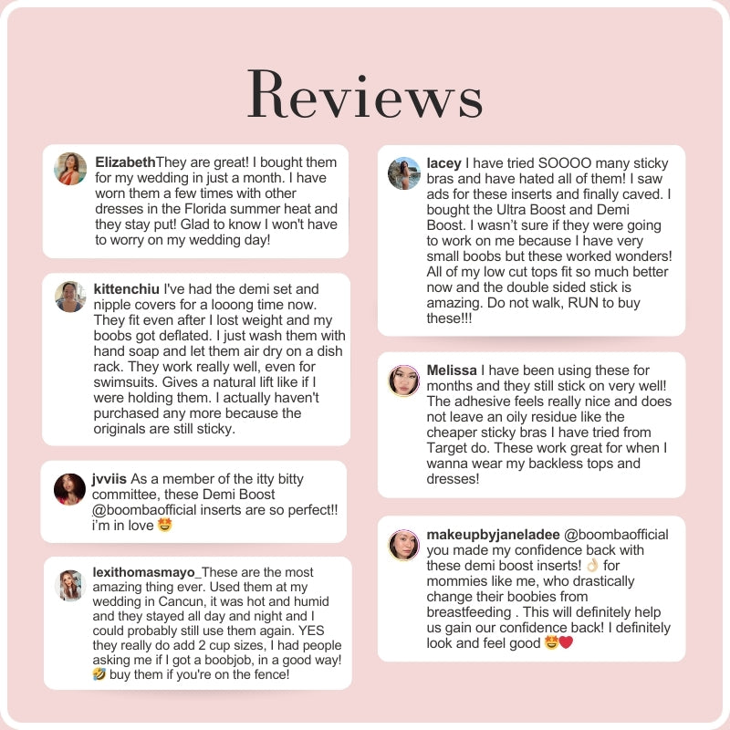 I have tried SOOOO many sticky bras and have hated all of them! I saw ads for these inserts and finally caved. I bought the Ultra Boost and Demi Boost. I wasn’t sure if they were going to work on me because I have very small boobs but these worked wonders! All of my low cut tops fit so much better now and the double sided stick is amazing. Do not walk, RUN to buy these!!!