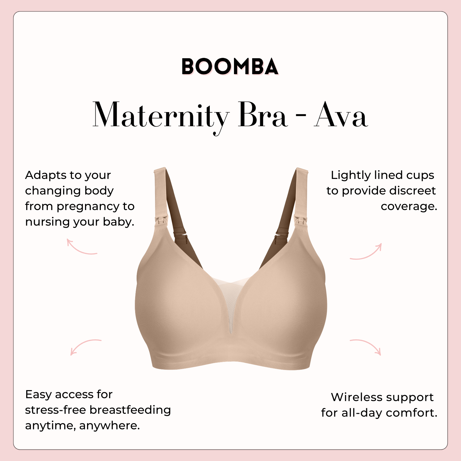 Our BOOMBA Maternity Bra - Ava delivers wire-free support with one-handed nursing access for stress-free feeding. Made from ultra-soft, stretchy fabric, it adapts as your body changes while still giving you the lift and support you need. Crafted with premium materials, it stays in shape wash after wash, no sagging, no stretching out.
