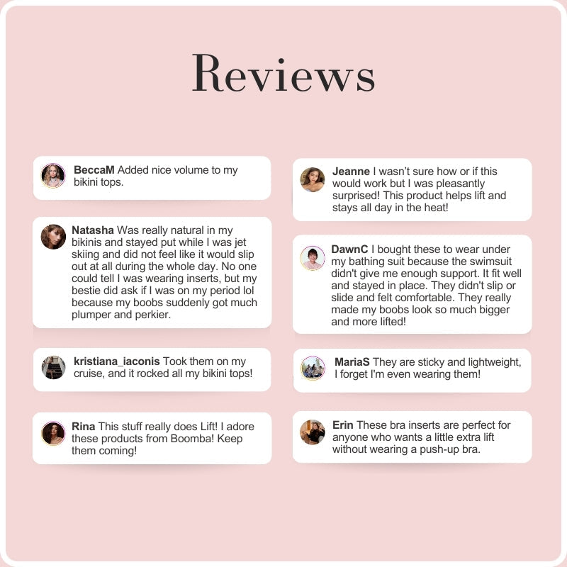 I have tried SOOOO many sticky bras and have hated all of them! I saw ads for these inserts and finally caved. I bought the Ultra Boost and Demi Boost. I wasn’t sure if they were going to work on me because I have very small boobs but these worked wonders! All of my low cut tops fit so much better now and the double sided stick is amazing. Do not walk, RUN to buy these!!!