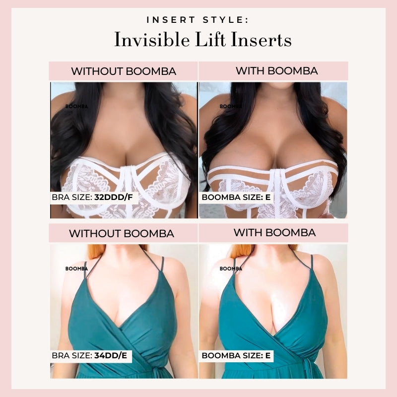 I used these for my wedding and it gave me the perfect amount of lift! I am a 36DD and these were perfect! They stayed in place all day and didn't notice they were there! Funny thing is that I put them on around 12 p.m and at 4 p.m. I looked down and realized I didn't take off the plastic part that goes against my chest, but it stayed perfectly in place even though it was really sweaty! I wore these until 2 a.m and they were still stuck to my dress and chest without moving after tearing up the dance floor all night! 10/10 worth the money! I am allergic to adhesive but these did not irritate my skin at all! The left is before the Boomba after having alterations done and the right is with the Ultra Lift Boomba insert!