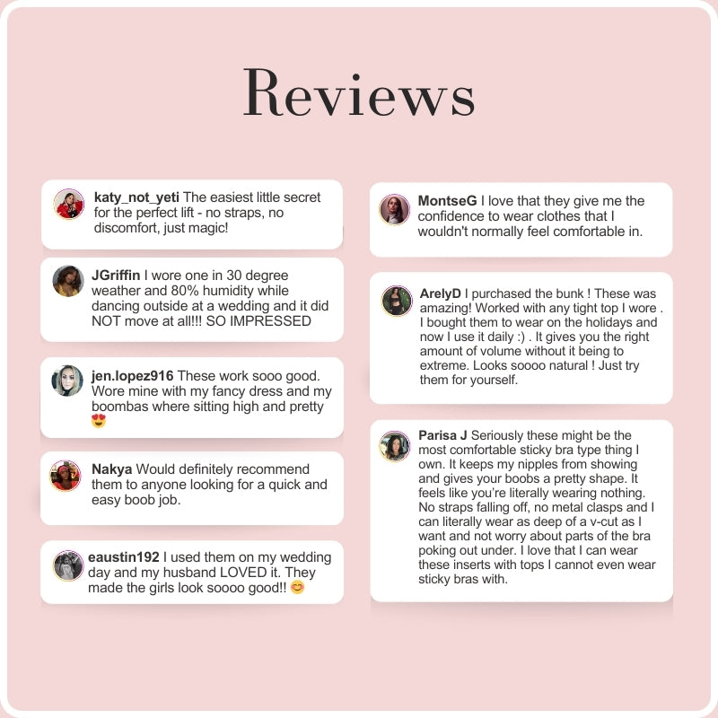 I have tried SOOOO many sticky bras and have hated all of them! I saw ads for these inserts and finally caved. I bought the Ultra Boost and Demi Boost. I wasn’t sure if they were going to work on me because I have very small boobs but these worked wonders! All of my low cut tops fit so much better now and the double sided stick is amazing. Do not walk, RUN to buy these!!!