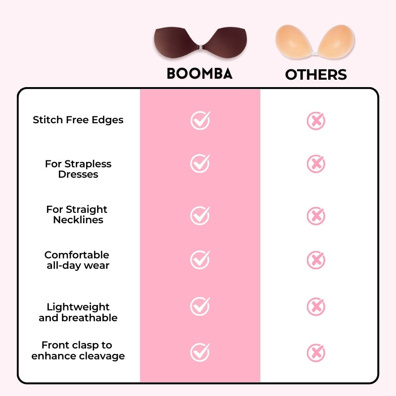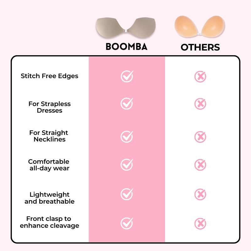 BOOMBA’s Demi Sticky Bra has a unique patented design. The bra cups in our Demi Sticky Bra are cut lower to ensure it always stays hidden under your top. The bra cups mold to fit your natural curves to provide natural-looking cleavage. Its stitch-free edging ensures it stays smooth under your clothing for a seamless look.
